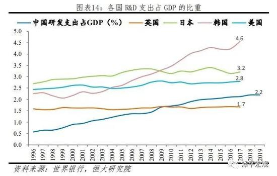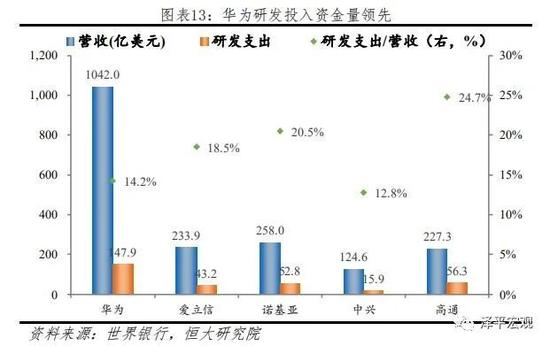 中国不断加大研发投入,在部分高科技领域与发达国家的差距逐渐缩小。2019年我国研发支出占GDP的比重为2.2%,而2000年这一比重仅为1.0%。截至2019年底,国家科技成果转化引导基金累计设立21支子基金,资金总规模达到313亿元。全年商标注册数量比上年增长27.9%。签订技术合同成交额比上年增长26.6%。中国在芯片制造、软件开发、航空等领域与以美国为代表的发达国家仍然存在差距,但中国在持续推进研发。以通信行业为例,当前全球四大通信设备巨头华为、爱立信、诺基亚、中兴,中国占据其二。华为2018年销售额1042亿美元,研发投入147.9亿美元,大幅超越传统通信设备巨头爱立信与诺基亚。与美国无线通信巨头高通相比,华为的收入与研发投入体量同样领先。在过去十年内,华为在研发领域累计投入超过4800亿人民币(约730亿美元),目前在全球范围内拥有超过8万份专利(超过90%是发明专利)。在5G的标准制定上,华为也开始崭露头角,中国在全球通信领域话语权逐渐提高。