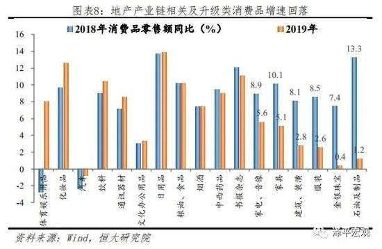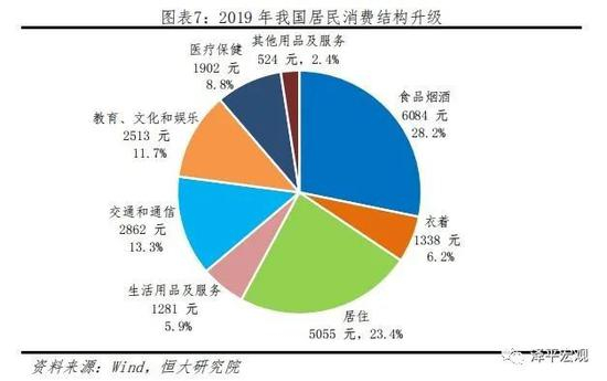 整体消费升级与部分人群消费降级并存。一方面我国居民恩格尔系数不断降低,消费结构升级。2019年食品烟酒支出占总支出比重为28.2%,较2018年下降0.2个百分点。根据联合国粮农组织标准,恩格尔系数达到30%-40%为富裕水平,低于30%为最富裕水平,由此从消费结构指标看我国已连续3年保持在“最富裕”水平。同时,全国居民人均消费支出中,服务性消费占比为45.9%,比上年提高1.7个百分点,消费结构改善。另一方面,地产产业链相关及升级类消费品消费增速下滑,带动消费增速下行,2019年全年消费增速创2000年以来新低。2019年社会消费品零售总额41.2万亿元,比上年增长8.0%,增速较上年放缓1个百分点。其中,石油制品类、金银珠宝类和服装类下滑明显,分别较上年增速下滑12.1、7和5.9个百分点。地产产业链相关行业也较大下滑,整体下滑-3.2%;其中,建筑装潢、家具和家电音像类分别较上年下滑5.3、5和3.3个百分点。汽车消费增速-0.8%,较2018年-2.4%的降幅收窄,但仍为负增长。居民收入增长放缓、杠杆率高和就业压力加大是居民消费放缓的重要原因。