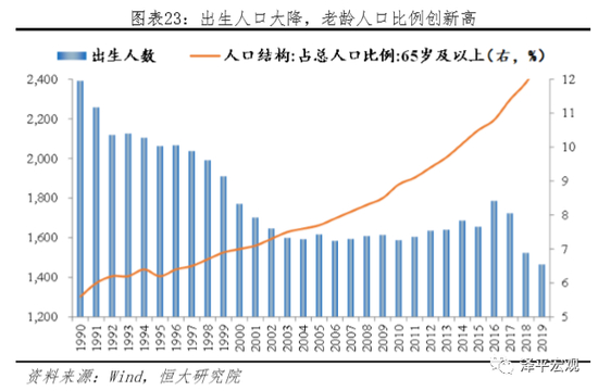2019年中国出生人口降至1465万,老龄化占比达12.6%,总人口突破14亿但临近峰值,人口危机渐行渐近。继2018年中国出生人口下降200万后,2019年出生人口再下降58万至1465万。2019年出生人口减幅明显收窄主要在于主力育龄妇女数量减幅边际明显收窄和生育率基本稳定,一孩和二孩出生数减幅均较2018年明显收窄。2016-2019年一孩出生人口从981万降至593万,没有一孩哪来二孩三孩,预示后续生育形势严峻。从长期趋势看,由于生育堆积效应逐渐消失、育龄妇女规模持续下滑,当前出生人口仍处于快速下滑期,预计2030年将进一步降至不到1100万。2019年中国65岁及以上人口占比达12.6%,中国人口老龄化加快,2022年将进入占比超过14%的深度老龄化社会,2033年左右进入占比超过20%的超级老龄化社会,之后持续快速上升至2060年的约35%。中国未富先老问题突出,美日韩老年人口比重达12.6%时人均GDP均在2.4万美元以上,而中国仅1万美元。2019年中国人口突破14亿,我们预测中国人口将在“十四五”时期陷入负增长,2050年左右开始将急剧萎缩,2100年占全球比例将从当前的约19%降至7%。
