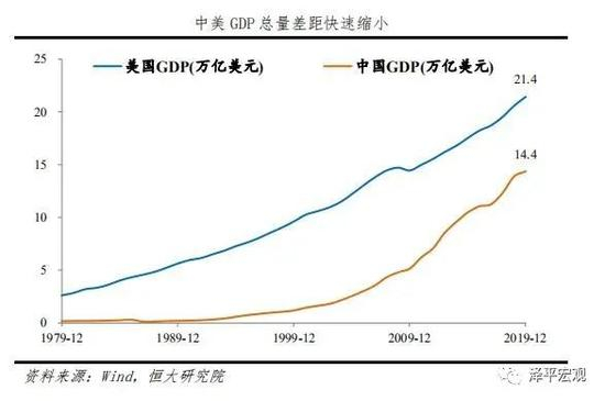 2019年中国GDP规模达99万亿元,相当于14.4万亿美元,而美国2019年GDP为21.4万亿美元,中国GDP相当于美国的约67%,中美差距正在快速缩小。2019年中国GDP实际增速6.1%,低于1978-2008年高速增长期的平均增速9.8%,但仍远高于美国2019年增速2.3%。据IMF估计,2019年全球GDP总量达86.6万亿美元,其中中国和美国占全球GDP比重分别为16.6%和24.7%,第三大经济体日本占全球GDP比重仅5.7%,中美主导全球。