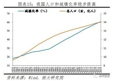 2019年城镇化率达60.60%,比上年末提高1.02个百分点,保持稳步增长态势,较高收入经济体的81.3%仍有20个百分点的空间。过去四十年,中国城镇常住人口从1.7亿快速增至8.5亿,净增加6.8亿,城镇化率从17.9%提升至60.6%,提高43个百分点,深刻地改变了中国经济社会格局,成就了过去中国重化工业、大规模基础设施投资、房地产、消费升级等的飞速发展。当前中国60.6%的城镇化率稍高于55.3%的世界平均水平,但明显低于高收入经济体的81.3%和中高收入经济体的65.2%,中国城镇化还有约20个百分点的空间,房地产业发展还有很大潜力,而住房制度改革长效机制推出将促进房地产市场平稳健康发展。2019年中国户籍人口城镇化率为43.38%,比上年末提高1.01个百分点。全国人户分离人口2.80亿人,其中流动人口2.36亿人,户籍改革和公共服务全覆盖仍需进一步推进。2018年第一、二、三产业就业人口占比分别约为26.1%、27.6%和46.3%,其中第一产业就业人员占比大幅高于第一产业占GDP比重的7.1%,第一产业就业人口向第二、三产业的转移还将持续。