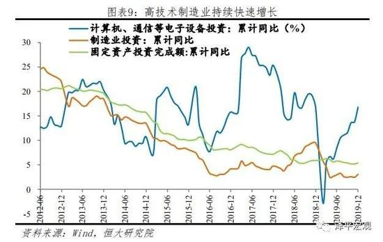 与此形成鲜明对比的是,新产业新业态快速崛起,全球最好的新经济就在中美,全球最好的投资机会就在中国。2019年高技术制造业、战略性新兴产业和装备制造业增加值分别比上年增长8.8%、8.4%和6.7%,增速分别较规模以上工业快2.9、0.5和1.4个百分点。全年高技术产业、工业技术改造投资分别比上年增长17.3%和9.8%。新兴工业产品产量快速增长,服务机器人、太阳能电池和移动通信基站设备分别比上年增长38.9%、26.8%和14%。