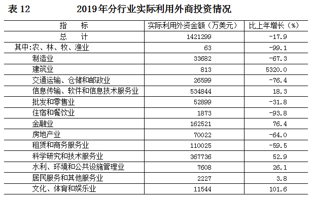 全年吸收合同外资259.7亿美元,比上年下降38.0%。实际利用外资142.1亿美元,下降17.9%;其中,信息传输、软件和信息技术服务业占37.6%,科学研究和技术服务业占25.9%,金融业占11.4%。