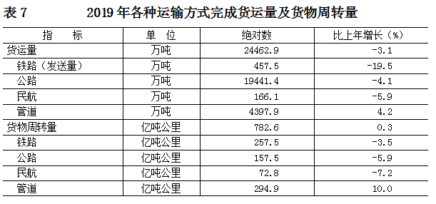 交通运输:全年货运量24462.9万吨,比上年下降3.1%;货物周转量782.6亿吨公里,增长0.3%。全年客运量72149.2万人,增长6.8%;旅客周转量2290.8亿人公里,增长3.2%。