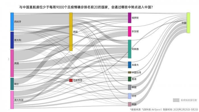比如,疫情比较严重的意大利主要从德国、俄罗斯和阿联酋中转进入中国,尤其是德国,从2月25日到3月2日,意大利到德国共有837个航班执飞,可投放座位超过13万个,而德国到中国内地过去一周共有19个航班执飞,投放座位数达7150个,北京首都机场、上海浦东机场和成都双流机场都有航班。俄罗斯也是一个需要重要关注的口岸,因为已有多起境外输入确诊案例都是从俄罗斯中转回国。飞友科技的数据显示,过去一周,意大利到俄罗斯队的航班高达203个,可投放座位超过3.3万个。俄罗斯到中国内地的航班则有19个,可投放座位数比德国的航班还高一些,达到8173个。目前俄航到北京、上海、广州以及香港目前都是正常的。