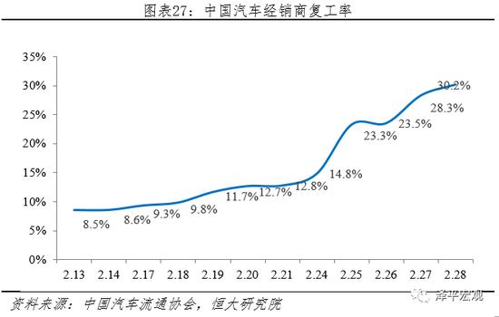 同时,上游产业链供应风险会造成车企人力、材料、物流等成本增加、盈利大幅削弱、存在资金链断裂、经销商延迟复工、消费者出行困难、收入减少,购车意愿下降,汽车消费严重下滑等一系列风险。以中国为例,据中国汽车流通协会统计,截止到2月28日我国汽车经销商复工率仅30.2%。