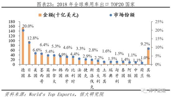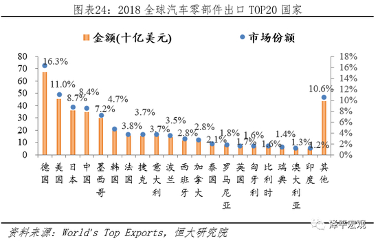 疫情较严重国家,中、日、韩、意、法,2018年乘用车、汽车零部件合计出口额分别为1880、1212亿美元。据World’sTop Exports统计,2018年全球乘用车、汽车零部件合计出口额分别为7752、4121亿美元;其中当前疫情较严重国家,中、韩、意、日、法五国乘用车、汽车零部件合计出口额分别为1880、1212亿美元,分别占比24.3%、29.4%。按照1个月疫情影响,不考虑出口额增长,估算2020年中、韩、意、日、法五国乘用车、汽车零部件合计出口额分别减少156.7、101.0亿美元;假设疫情进一步扩散到德国、美国,中、韩、意、日、法、德、美七国乘用车、汽车零部件合计出口额分别减少328.4、194.8亿美元。