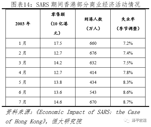 短期而言,疫情扩散会对餐旅、交运、零售、娱乐等需要人员聚集的行业需求造成较大冲击,从而造成短期失业率上升、经济衰退。例如2003年SARS期间,香港部分零售商4月零售额同比下滑30%-50%、航班数减少50%。而一旦疫情得到控制,这部分需求会快速反弹。