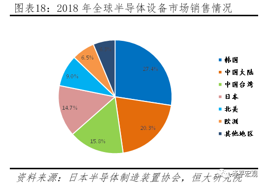 中国为全球半导体材料和设备重要采购国,将受到直接影响。材料方面,据国际半导体产业协会(SEMI)数据显示,2018年上游材料端市场投资规模519.4亿美元,中国台湾连续9年第一、市场份额22%,韩国(16.8%)、中国大陆(16.2%)、日本(14.8%)、北美(10.8%)分别为第二、三、四、五。设备方面,2018年全球半导体设备共投资645.3亿美元,同比增长14%,韩国以177.1亿美元连续两年排为第一,中国大陆首次超越中国台湾成为全球半导体设备花费第二高国家,主要原因在于贸易局势令中国内地芯片设计、制造等企业大力度进行研发投入,中国大陆设备投资金额达131.1亿美元,同比增长59.3%。中国台湾(101.3亿美元)、日本(94.7亿美元)、北美(58.3亿美元)排名第三、四、五。