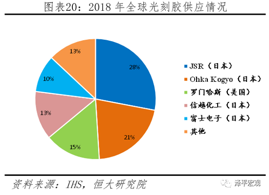 日本是硅晶圆、光刻胶等原材料的主要供应国家。硅晶圆是半导体制作所用的硅晶片,是最基础和重要的材料,目前主要被日本、德国和韩国企业包揽,其中日本信越化学、Sumco多年保持前二,合计市场占比超过50%。光刻胶用于集成电路细微图形加工,被JSR、信越化工、Ohka Kogyo、富士电子等日本企业垄断,四者合计市场占比超过70%。