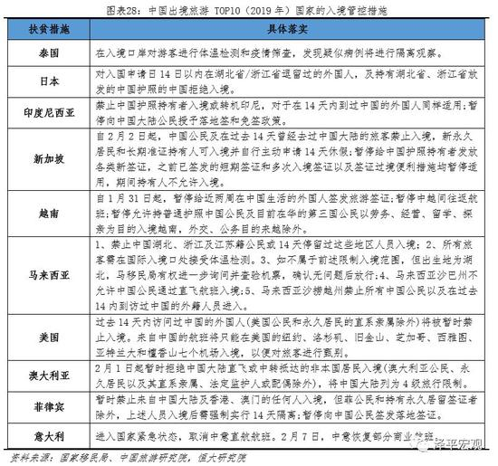 全球来看,亚太地区受疫情波及最大。在消费者旅游信心骤降和出境管控背景下,中国游客出境游人次大幅减少。往年春节期间是中国游客出行游玩黄金时期。而今年1月31日WHO通报本次新冠疫情构成突发卫生公共事件(PHEIC),随后多个国家和地区宣布中国或从中国出发的外国游客采取禁止或限制入境的措施,目前共有130余个国家对中国及从中国出境的外国人采取了严格的入境政策。2019年中国游客出行TOP10国家对中国游客均加强了入境管控。往年春节期间亚太地区的中国旅客占比达到75%。1月20日-1月27日,我国亚太目的地出行订单下降15.1%,美洲下22.5%,非洲与中东下降9.9%。后续随着国内疫情及全球疫情的蔓延,对出境游的影响给还在进一步深化。