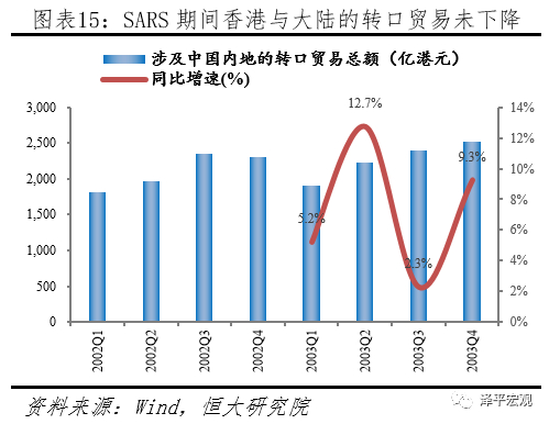从2003年香港SARS的案例可以总结,3月份SARS在香港爆发,到5月疫情基本得到控制,期间对零售、旅游、民航等行业冲击最严重的主要是3至5月,随后这些行业需求开始逐渐恢复,到8月已经基本恢复到疫情发生前的水平。从失业率来看,2003年香港失业率在7月到达顶峰,随后才开始下降,相对而言企稳时间存在1到2个月的时滞。总体而言,疫情控制后2到3个月内,经济开始反弹企稳。值得注意的是,在SARS期间,得益于珠三角地区工业生产和物流运输正常运转,香港与大陆之间的转口贸易并没有受到影响,2003年第二季度香港与大陆之间的转口贸易金额甚至同比增长了12.7%,虽然第三季度环比有所回落,但仍然保持正增长。因此SARS并没有影响香港作为大陆贸易和金融门户的产业链地位,这对于香港和珠三角地区在疫情后经济快速恢复具有重要意义。