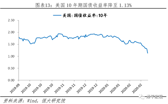 疫情对债市的推动主要分为两方面:一方面疫情的扩散与传染对消费、生产与投资带来负面冲击,实体经济短期走弱有利于推动债市走强;另一方面,疫情带来的恐慌情绪推升避险情绪,带动利率下行。2月28日,无论长期美国国债还是短期美国国债收益率均急剧下跌,美国10年期国债收益率持续下降至1.13%,5年期美国国债收益率跌至创2016年以来首次跌至1%以下至0.89%,2年期美国国债收益率降至0.86%。其他国家国债也展现同样的避险情绪,日本1年期国债下跌至-0.197%、10年期国债下跌至-0.104%,澳大利亚10年期国债下跌至0.84%。