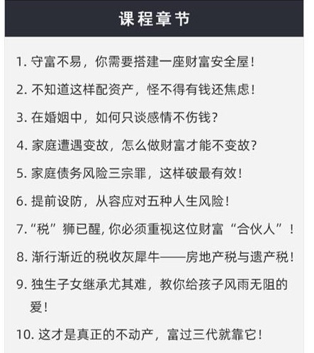 这套课程花了将近一年的时间,光是课程提纲就改了5稿之多。课程中详解每一种工具的优势和不足,从和大家切身利益最密切的五大风险出发,婚姻、债务、税务、人身、传承风险,通过具体场景和案例教会大家工具的应用。攻守兼备,才是财富稳健增值、有序传承之道。《人人都需要的家庭财富安全课》点击链接,即可立即试听!