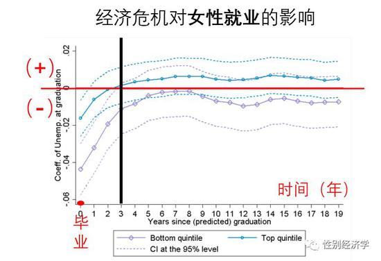 经济衰退对女性就业的负面影响在3年后既不复存在。(图中蓝色代表高成绩组,紫色代表低成绩组。)