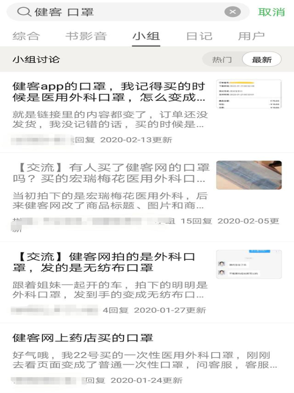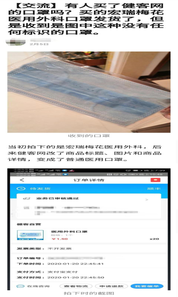 一方是健客网的创始人兼大股东,一方面为创始人亲自聘任的职业经理人,苏、谢二人的争论闹得沸沸扬扬,谁真谁假一时也难以认定。但从网络公开信息来看,健客网疫情期间违规兜售口罩的情况可能确实存在。多个社交平台均有不少曾在健客平台订购口罩的消费者曝光相关违规违法行为。2月5日,也就是苏展实名举报的前两天,有消费者指出,其在健客网订购了某品牌的医用外科口罩,但收到时却是没有任何标识的普通口罩,厂家也无法在药监局查询系统中查询到。在其他社交平台,也有不少消费者反映在健客平台购买的医用口罩被掉包为普通口罩的情况。