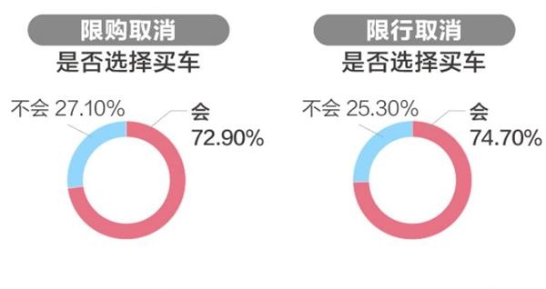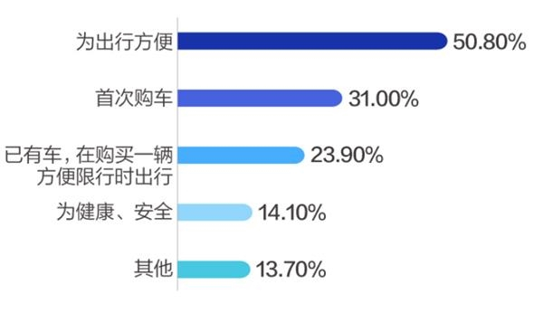 本次调查数据显示,汽车限购/限行政策是限制不少消费者购车的主要因素。若限购政策取消,有72.9%的受访者将考虑买车。若不考虑限购政策,在消费者选择购车的理由中,出行方便位居第一位,首次购车紧随其后,添置新车方便限行时使用位列第三。