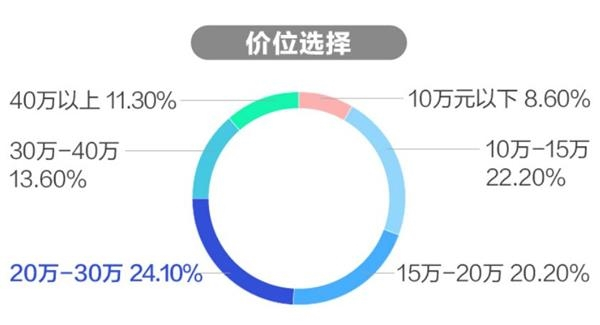 消费升级是购车的主要趋势之一。调查显示,20万-30万元价位区间车型成为消费者的主流选择,仅有不足10%的消费者会考虑购买10万元以下车型。在车型选择方面,SUV成为购买意愿度最高的车型,轿车紧随其后。
