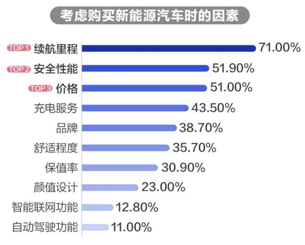 调查显示,在考虑购买新能源汽车时,续航里程、安全性能和价格是消费者最看重的三大因素,分别占比71%、51.9%和51%,在很大程度上决定着购买行为。此外,充电服务和品牌要素也较为重要,分别占比43.5%和38.7%。