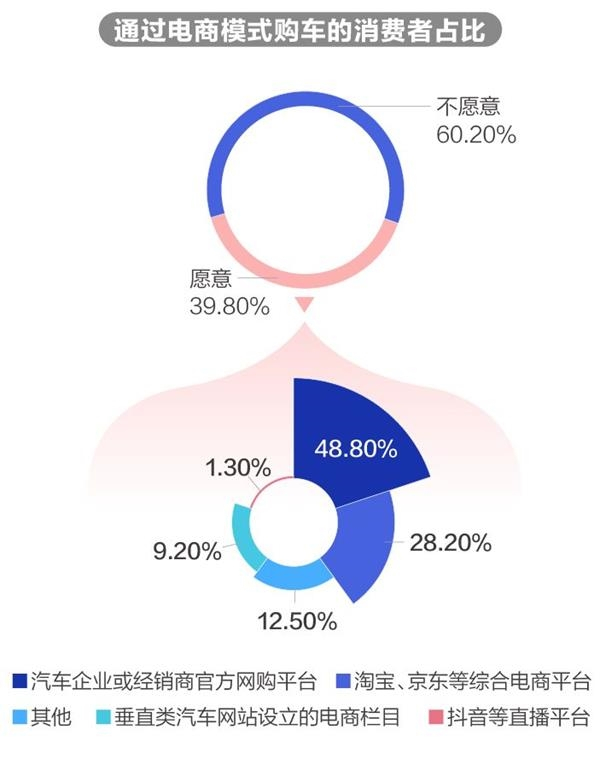 调查数据显示,超六成的受访者不愿意通过电商模式购车,只有39.8%的受访者愿意选择电商模式购车。在愿意选择电商模式购车的受访者中,有48.8%的受访者表示会在汽车企业或经销商官方网购平台上购买,排在第一位;有28.2%的受访者表示会在淘宝、京东等综合电商平台购买,排在第二位;只有不到2%的受访者表示直播平台购买,这意味着直播平台还不是汽车消费的主要渠道。