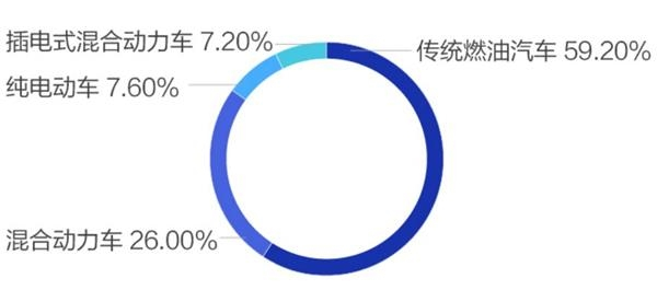 在传统燃油车和新能源车的选择上,有六成消费者选择了传统燃油车。此外,消费者对混合动力车型的购买意愿在新能源车中占比最高。