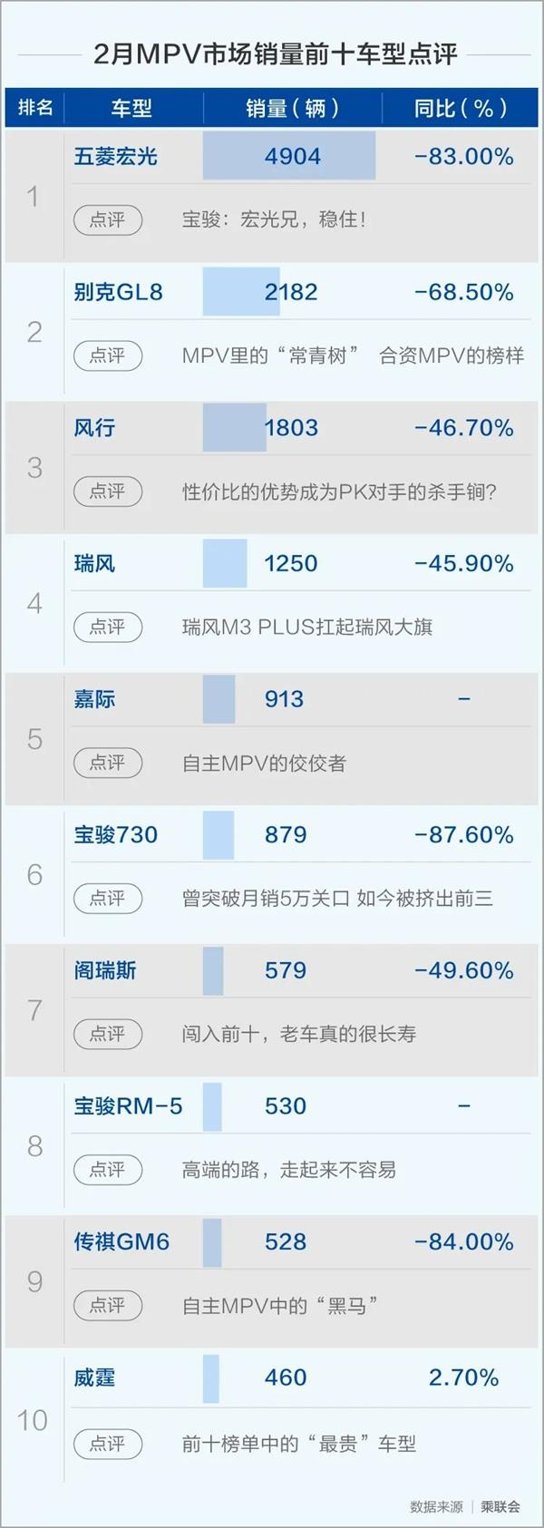 事实上,MPV市场已连续两年下降,市场份额从2017年的8.5%下降到2019年的6.6%。但即便如此,MPV市场的竞争仍未停止。在2月MPV销量前十车型中,自主品牌占据了8个席位。五菱宏光依然位居第一位,风行从1月的第四位上升至第三位,嘉际闯入前十,位居第五,宝骏730、宝骏RM-5排名分别下滑至第六位和第八位,宝骏360跌出前十榜单。