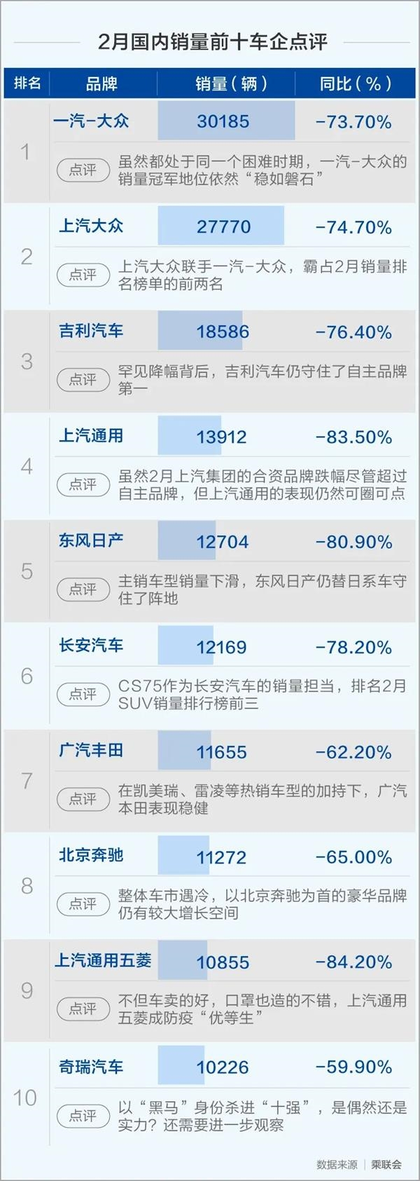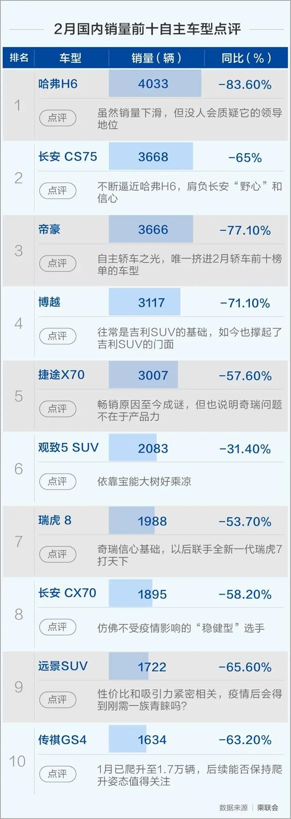 2月,多家自主车企出现了史无前例的下跌幅度,销量排行也大洗牌。