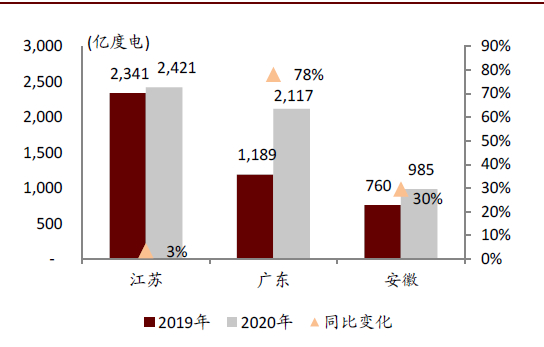 图表: 江苏、广东、安徽2020年度双边协商电量情况(上图)及占市场化电量规模比例(下图)