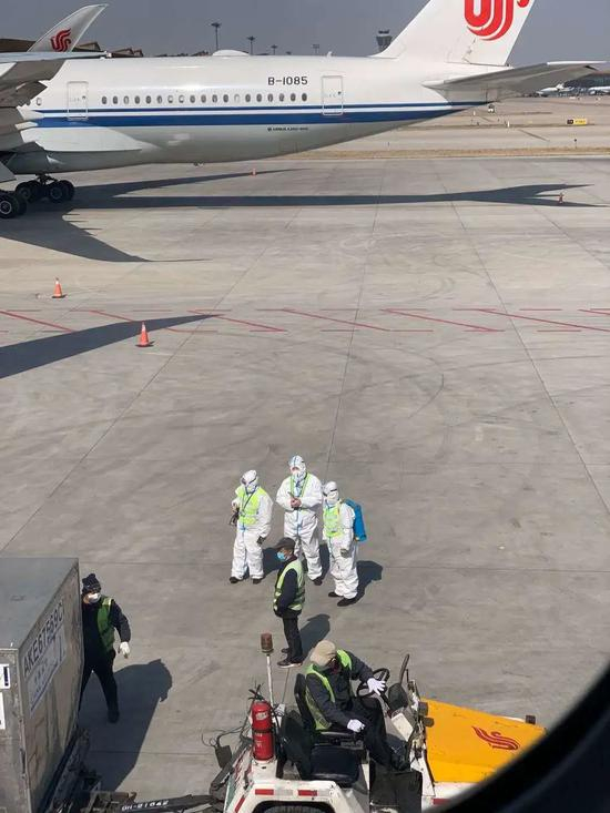 我在3月15日落地北京首都机场,国内机场的防护做得特别严。当时国外的航班特别多,需要分批下机,先是西班牙、意大利等疫情严重的国家航班,接着才是我们。我是早上8点50分落地的,11点才下飞机。抵达之后,在机场一路填表,测体温,全程有专属通道。