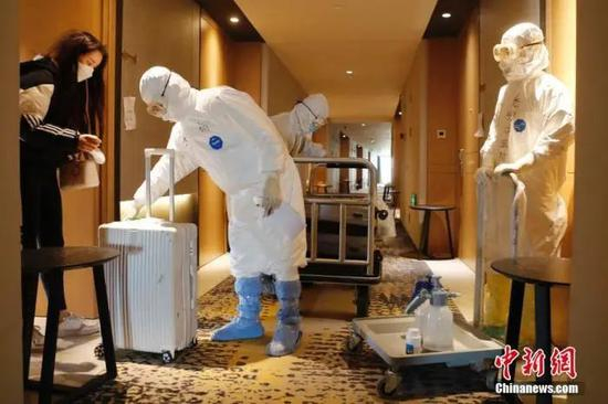 资料图:3月16日,工作人员对即将解除隔离的旅客进行行李消毒。中新社记者 殷立勤 摄