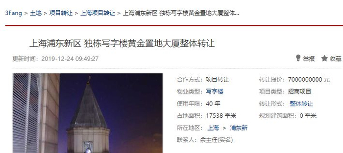 但记者近日再次打开3Fang网站时,却发现项目介绍中对黄金置地大厦的市场估值变成了“不低于100亿元”,整体转让价仍为70亿元。信息更新时间显示为2019年12月24日。