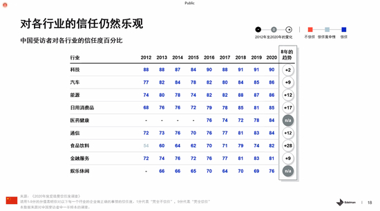 报告显示,中国受访者对各行业的信任度保持乐观,90%的中国受访者认为科技行业仍是最受信任的行业,排名第一;汽车行业和能源行业以86%的分值并列行业信任度排名第二;纵观过去八年的数据,食品和饮料行业的受信任程度达到82%,八年来涨幅最大(增长28%),日用消费品行业的受信任程度为85%,八年来涨幅次之(增长17%);