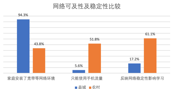 调查结果显示,有43.8%的农村家庭安装了宽带等网络环境,这一比例仅相当于县城学生家庭的一半。51.8%的农村学生使用手机流量进行网络学习,61.1%的农村学生反映网络稳定性影响学习,而县城学生只有17.2%反映了这一问题。