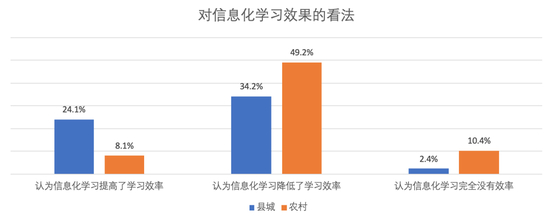 数据表明,24.1%的县城学生认为信息化提高了学习效率,而农村学生的这一比例仅为8.1%。