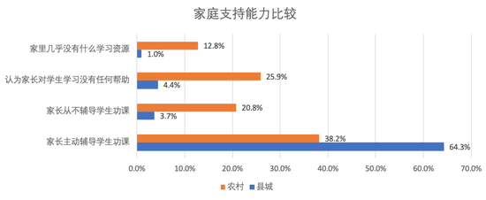 数据说明,相比于县城,农村学生在信息化学习过程中的家庭支持能力不足,父母常处于缺位状态,相应的学习资源也非常有限。