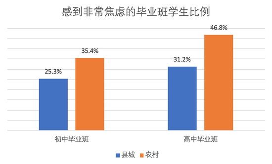 初中毕业班农村学生感到非常焦虑的比例为35.4%,比县城学生高出近11个百分点。高中毕业班的农村学生感到非常焦虑的比例为46.8%,比县城学生高出了15个百分点。