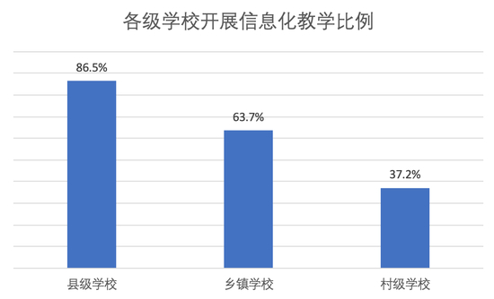 调查数据显示,县城约有60%的教师参加信息化教学,另外40%多的教师没有进行信息化教学工作。县级学校教师开展信息化教学的比例较高(86.5%),村级学校最低(37.2%),乡镇学校介于两者之间(63.7%)。