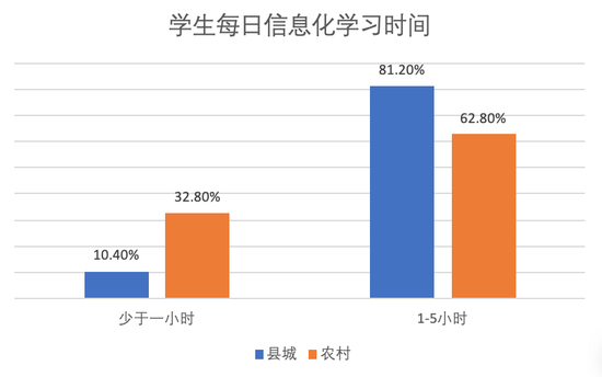 信息化学习时间方面,农村学生每天信息化学习时间偏短,学习时间少于1小时的比例是县城学生的3倍。县城学生每天学习1-5小时的比例比农村学生高出近20%。