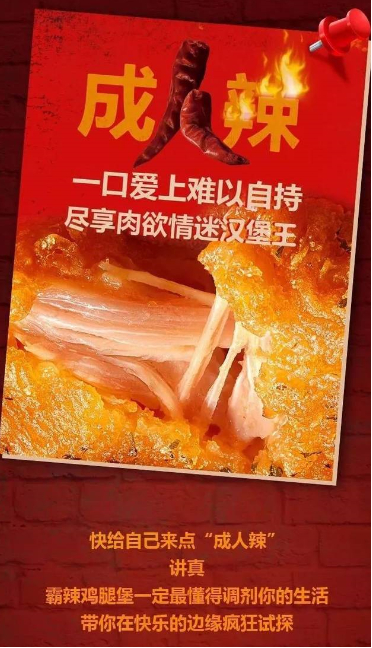 “快给自己来点成人辣, 讲真,霸辣鸡腿堡一定最懂得调剂你的生活,带你在快乐的边缘疯狂试探”等。