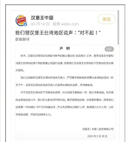 3月29日下午,汉堡王(中国)投资有限公司通过其官方微博发布声明,承认汉堡王台湾地区社交账号发布上述不当表述,并表示“我们替汉堡王台湾地区说声‘对不起’”,同时声明二者属不同的两家公司进行运营,“我们为汉堡王台湾地区不负责任的言论表示愤怒。”当晚,上述不当言论内容已删除。