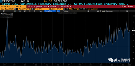 因此,财政刺激的国债融资,从发行种类的选择上肯定是以零息的国库券为主,付息的中长期国债为辅的。下图是2008金融危机以来美国财政部发行国库券规模的情况,可以看到近五年来国库券的发行总量都是逐年上升的,而且预计随着此次财政刺激政策的推出,国库券的发行规模还会有一个快速的增长。