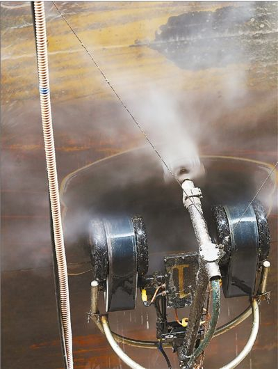 4月6日,浙江舟山市长白岛,机器人“飞檐走壁”为集装箱船进行除锈作业。