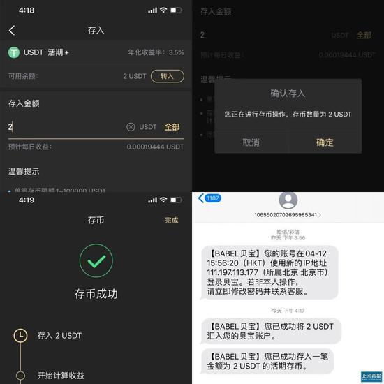 不过,北京商报记者亲测发现,在注册账户后,向贝宝金融账户汇入USDT后,仅在5分钟内,便顺利完成了存币业务操作,其中并未有风险提示和警告。
