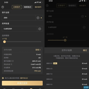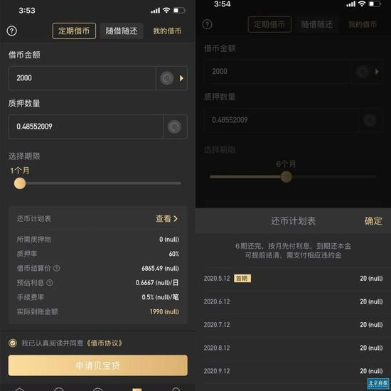北京商报记者体验发现,以贝宝贷产品为例,在贝宝金融借币前,需保证账户有定量的资产,如需借2000USDT,得先向账户汇入约0.49个比特币用于质押,预计利息0.33USDT/小时,手续费0.5%USDT/笔,实际到账1990USDT。