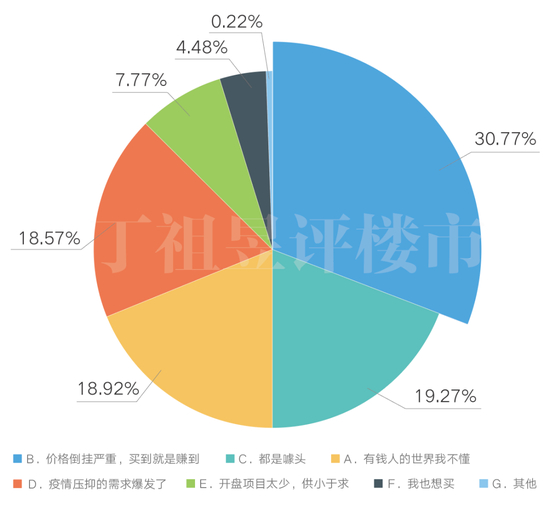 值得一提的是,以投资保值为主要目的的比例达到19.52%,排在了第三位。可以看出,受疫情蔓延影响,全球都在放水救经济的同时,市场对于通胀和货币贬值的预期非常强烈,而投资者害怕资产贬值,为了抵御通胀,因此会在此时选择购房保值。