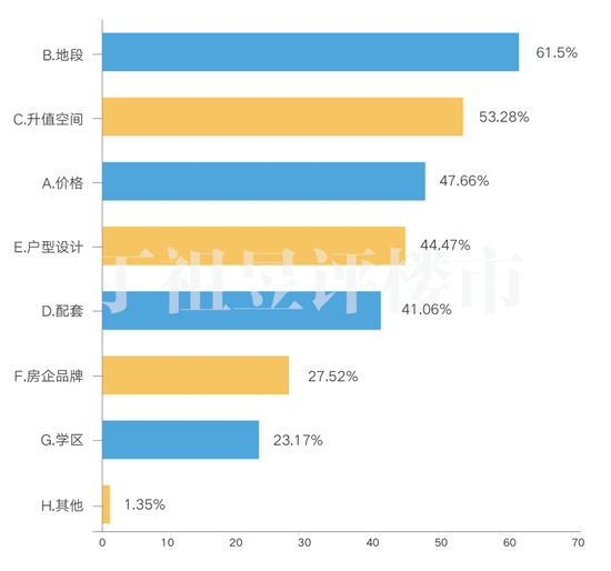 相较于此前的调查结果,此次购房决策也发生了改变。其中,“地段”、“升值空间”和“价格”成为影响购房决策的前三项,而“房企品牌”这一选项落至第六位。