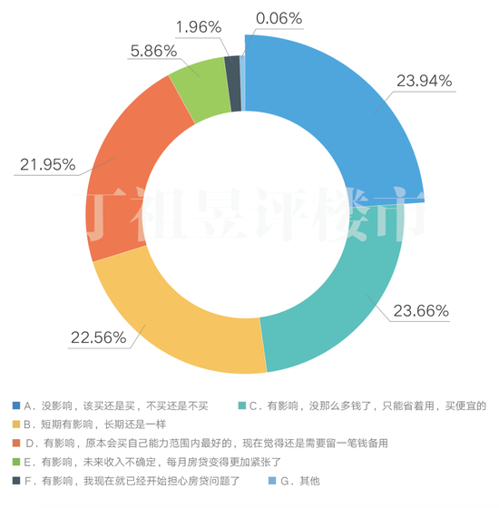 目前,全民收入已进入下调阶段,有68.17%的受访者受到疫情影响购房预算发生了变化。其中,“没那么多钱了,只能省着用,买便宜的”比例为23.66%,“原本会买自己能力范围内最好的,现在觉得还是需要留一笔钱备用”的比例为21.95%。也有22.56%的人认为“短期有影响,长期还是一样”。“没影响,该买还是买,不买还是不买”的比例也达到了23.94%。