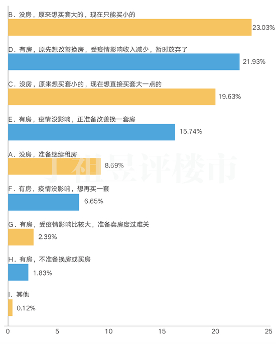 最为明显的是,原本打算卖掉一套房子重新置换的人群,受疫情影响,收入减少,所以暂时放弃了换房计划,这一部分比例达到了21.93%。而叠加1.83%“原本有房,不准备换房或买房”的人群,放弃置业计划或不打算置业的比例达到了23.76%。
