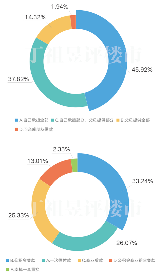购房款来源选项中,45.92%的购房人群购房款由自己全部承担,也有37.82%的购房人群自己承担一部分,父母提供部分购房款,父母提供全部购房款的比例为14.32%。问亲戚朋友借款的购房人群也有1.94%的比例。