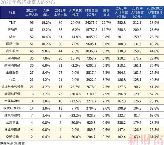 涨幅超过20倍的富人中,TMT行业贡献了8名,占比21%,为各行业中排名最高。